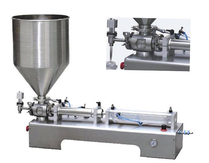 Horizontāls vienvirziena virzuļa pildītājs viskozam šķidrumam, piemēram, kečupu, majonēzi, krējumu, sviestu, džemu, medu, šampūnu uc