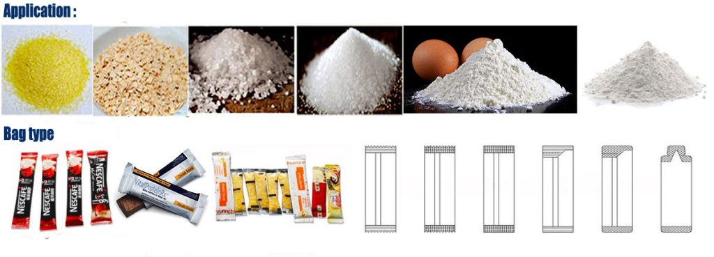 Šo mašīnu galvenokārt izmanto, lai iepakotu pulverveida produktus: tādus kā piena pulveris, piena tējas pulveris, kafijas pulveris, garšvielas, karija pulveris, olbaltumvielu pulveris, garšviela, augu pulveris, ķīmiskie un medicīniskie pulvera produkti.