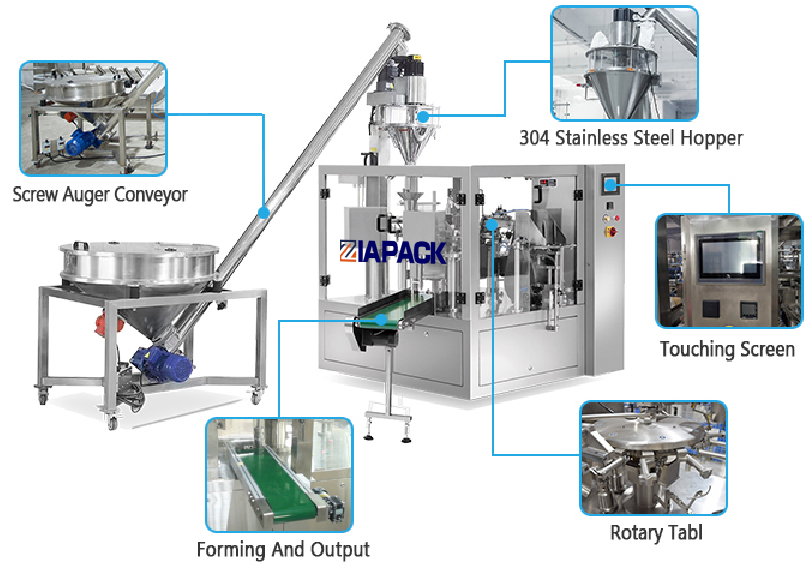 Aprīkots ar Augur Filler un Screw Elevator, to plaši pielieto iepakojuma pulverim, piemēram, mazgāšanas pulverim, piena pulverim, miltiem, garšvielām, kokosa pulverim, maltajai kafijai un tā tālāk.