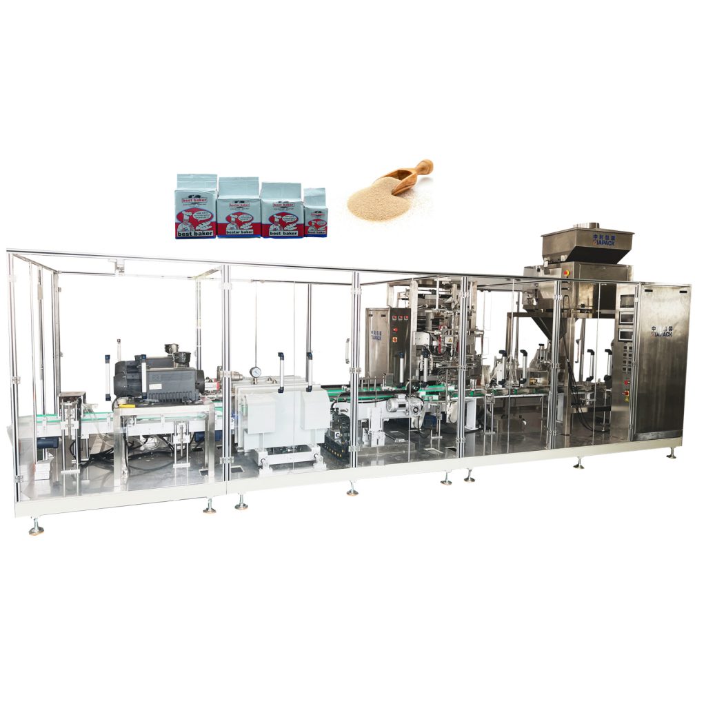 Šī iekārta ietver vienu komplektu ZK3 vakuuma liftu sausā rauga padevei, vienu komplektu ZL520 vertikālo maisu izgatavošanas iepakošanas un aizzīmogošanas mašīnai.vienu komplektu ZLC4-2000 četru kausu svēršanas mašīnu, vienu komplektu ZL-100V2 dubultās vakuuma kameras iepakošanas mašīnu. Šo mašīnu plaši izmanto pārtikas aptieku ķīmisko vielu un citu produktu iepakošanai pulverī vai mazās granulās. Tāpat kā kafijas pulveris, rauga pulvera kviešu milti un tā tālāk. Visa iekārta tiek izmantota iekšpuses sūknēšanai uz vakuuma produktu. Vakuuma pakāpe ir ļoti augsta, un iepakošanas ātrums ir ļoti augsts, var sasniegt 30 maisiņus minūtē. Gatavajam produktam ir ilgs glabāšanas laiks un skaista forma.